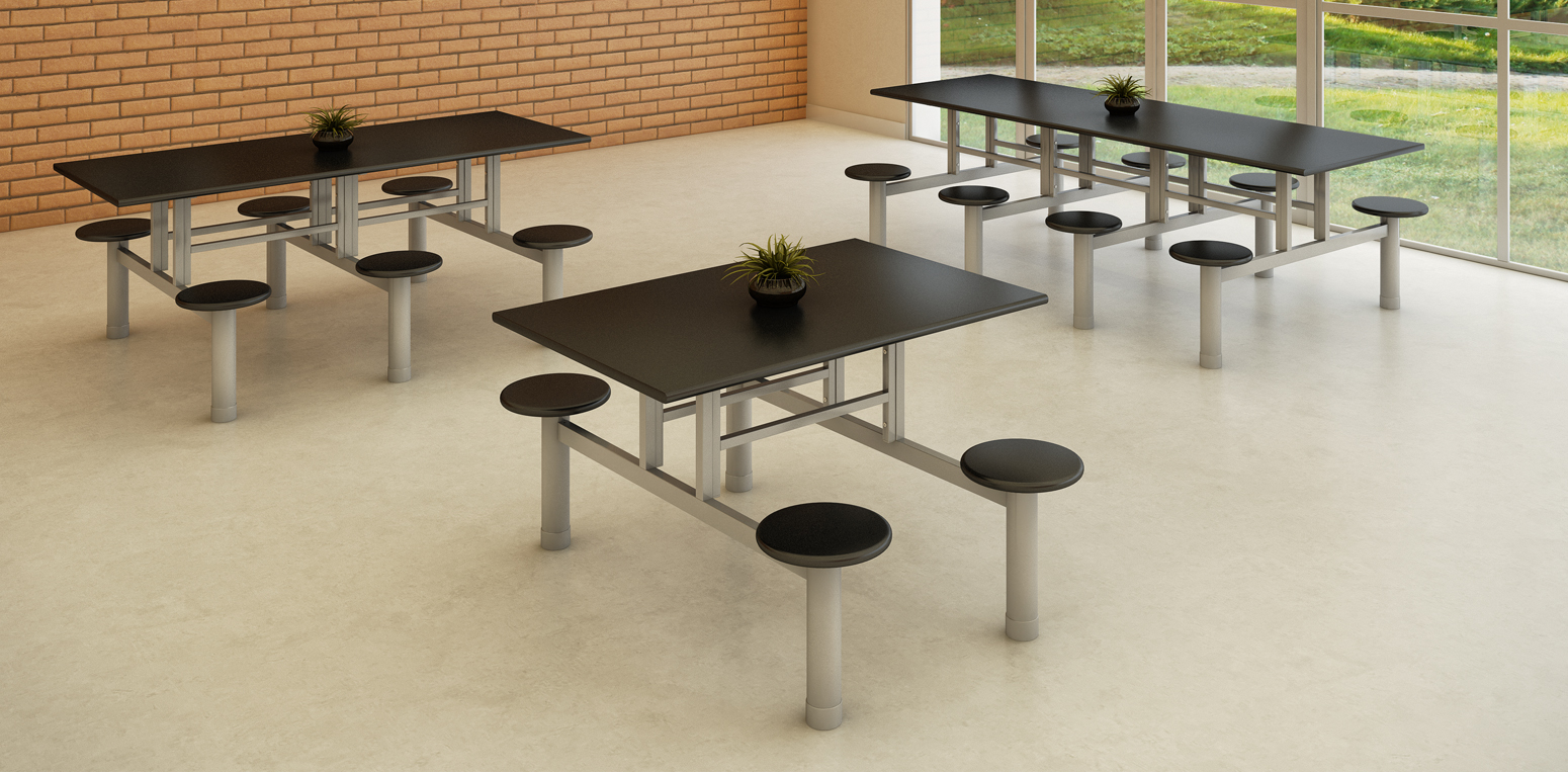 Este conjunto de móveis foi projetado para ambientes de refeição coletivos que priorizam praticidade, resistência e organização, As mesas com bancos fixos reduzem o deslocamento dos móveis, facilitam a limpeza do piso e otimizam o uso do espaço, O design une estrutura metálica resistente com acabamento moderno e elegante, criando um ambiente agradável e eficiente.