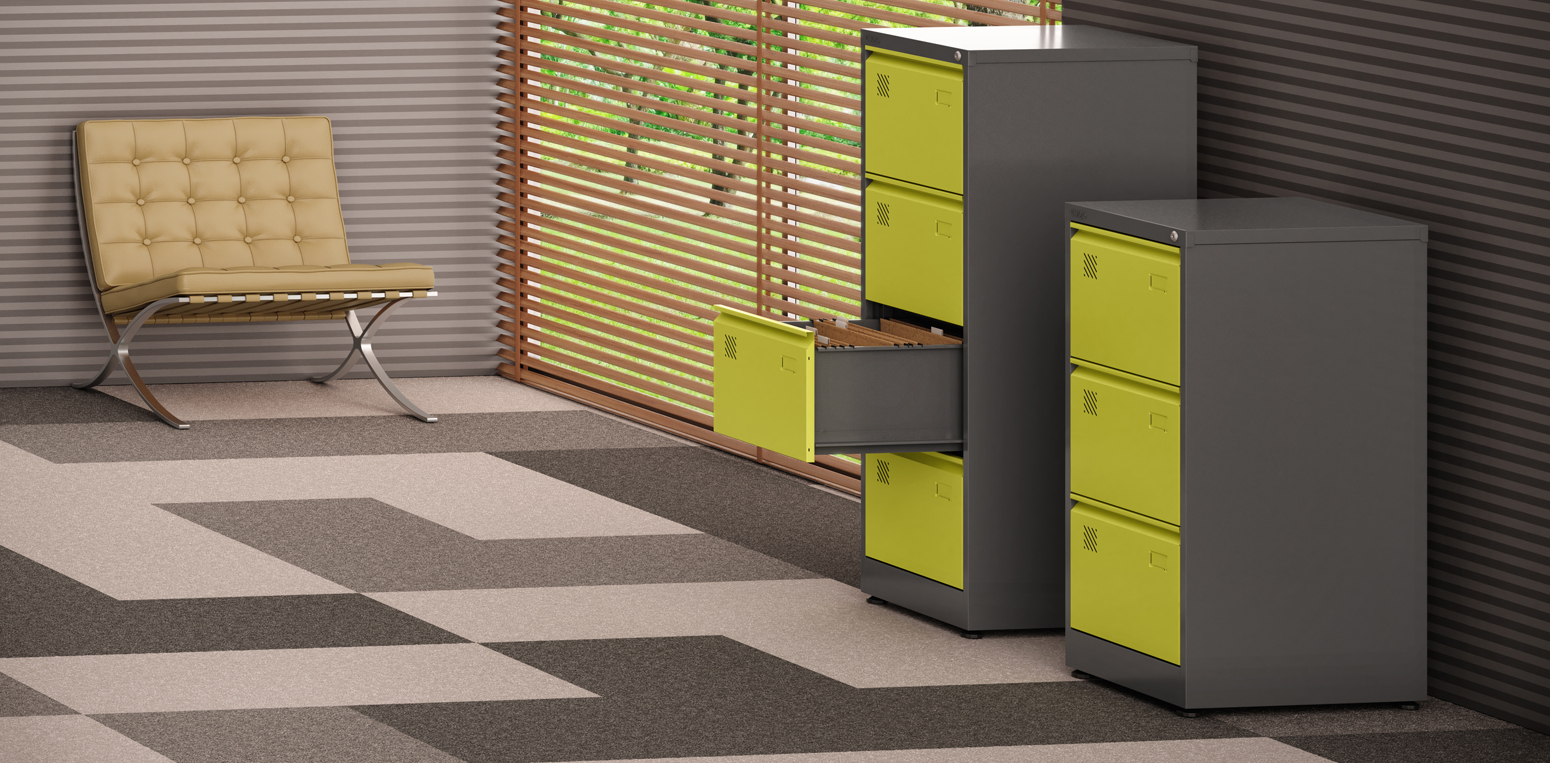 Armários arquivo alto (gaveteiros altos): Com quatro gavetas grandes As frentes das gavetas são em amarelo esverdeado (tom de verde-limão), o que dá um toque moderno e vibrante, Opções personalizáveis em tamanho e cores. No topo, há uma tampa metálica plana, ideal para apoiar objetos ou documentos.