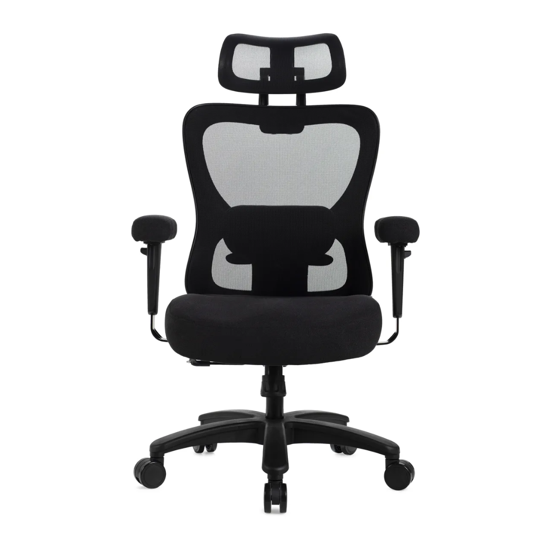Encosto em tela de poliéster com apoio lombar estofado. Apoio lombar com tensor e regulagem de altura. Apoio de cabeça com estrutura em nylon e revestimento em tela, com 9 regulages de altura e rotação. Assento estofado revestido em tecido, com bloco de 25 molas ensacadas e espuma laminada de alta densidade. Braço estofado revestido em tecido com regulagem de altura em 6 posições. Mecanismo sincronizado com 3 travas. Pistão preto classe 4 BIFMA. Aranha 350mm Nylon. Rodízios 75mm em PU. Recomendada para até 140Kg. 1 ano de garantia.