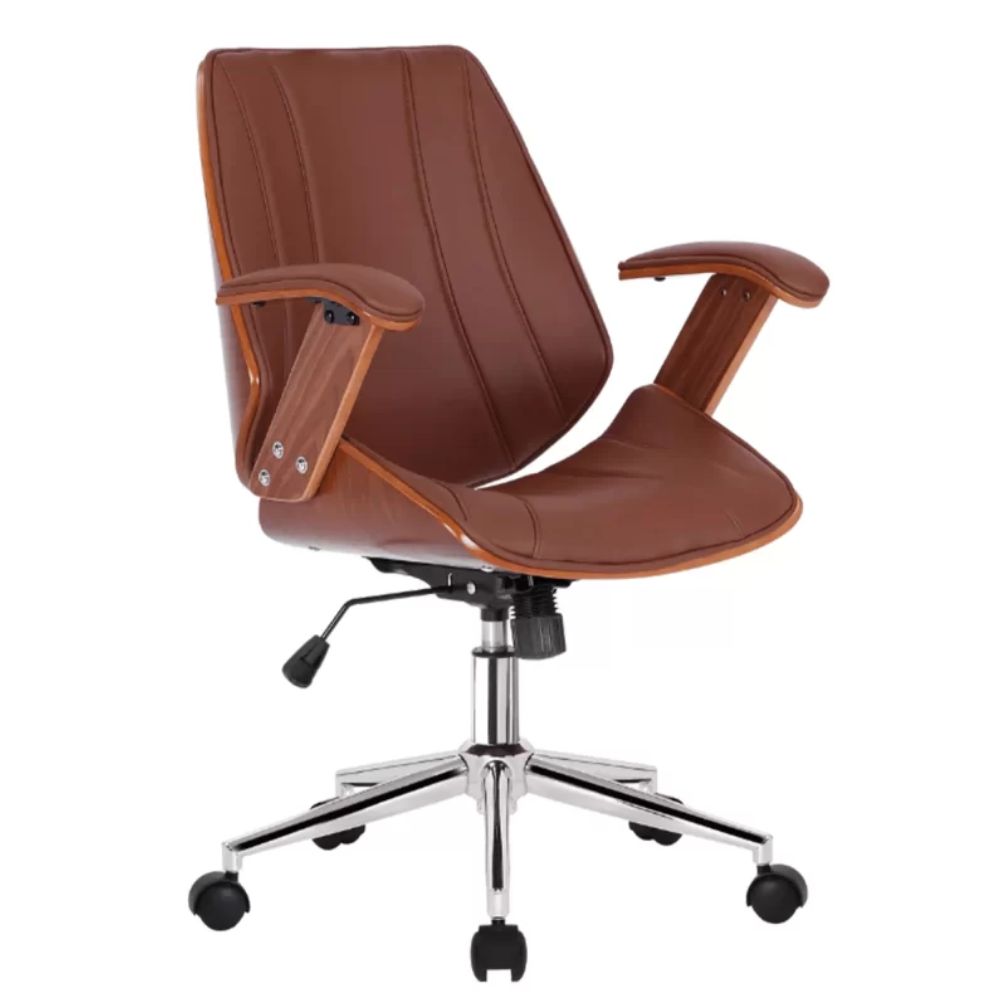 Material: Estrutura em madeira multilaminada com base cromada e assento e encosto revestido em couro ecológico (PU). Rodízio em PU (poliuretano).