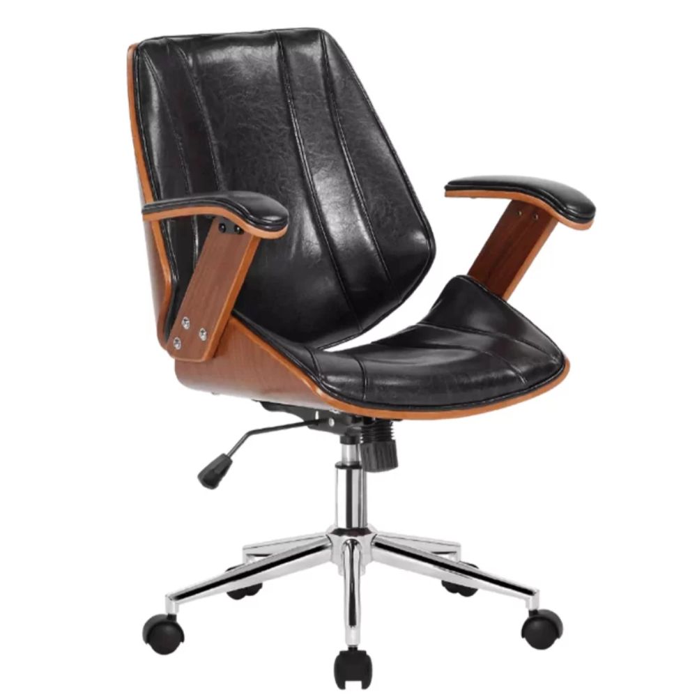 Material: Estrutura em madeira multilaminada com base cromada e assento e encosto revestido em couro ecológico (PU). Rodízio em PU (poliuretano).