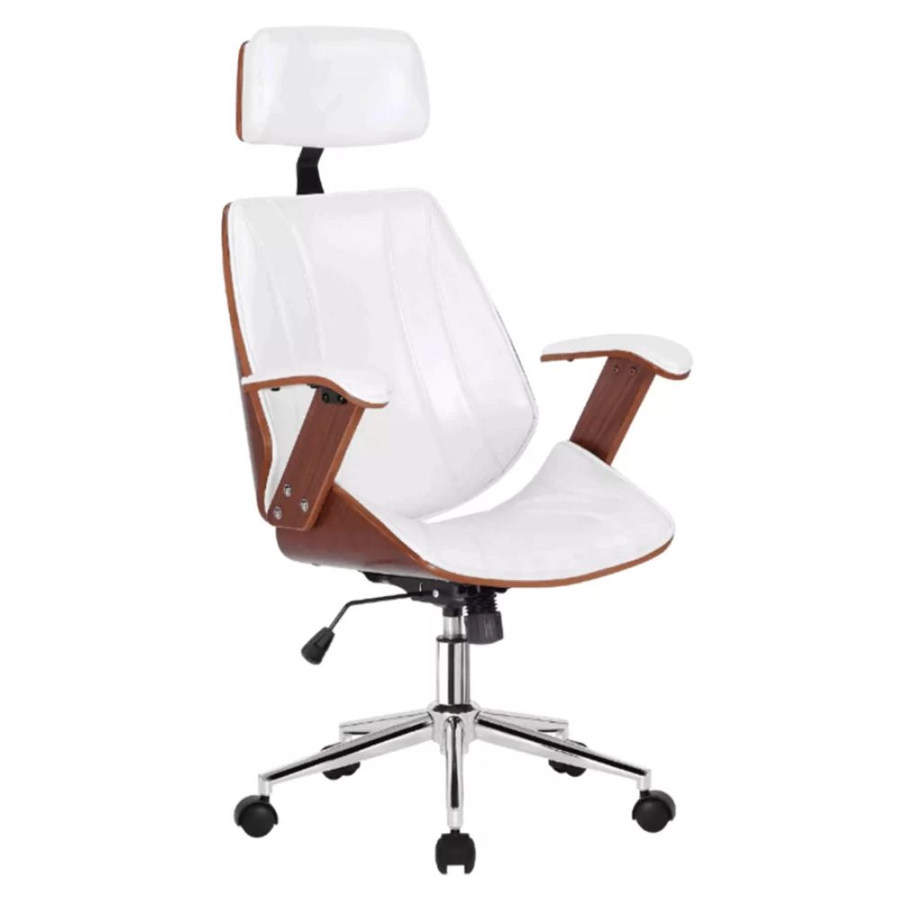 Material: Estrutura em madeira multilaminada com base cromada e assento e encosto revestido em couro ecológico (PU). Rodízio em PU (poliuretano).