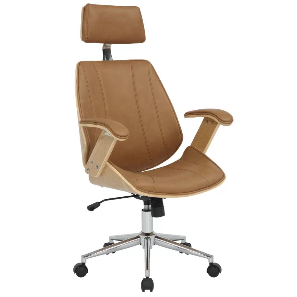 Material: Estrutura em madeira multilaminada com base cromada e assento e encosto revestido em couro ecológico (PU). Rodízio em PU (poliuretano).