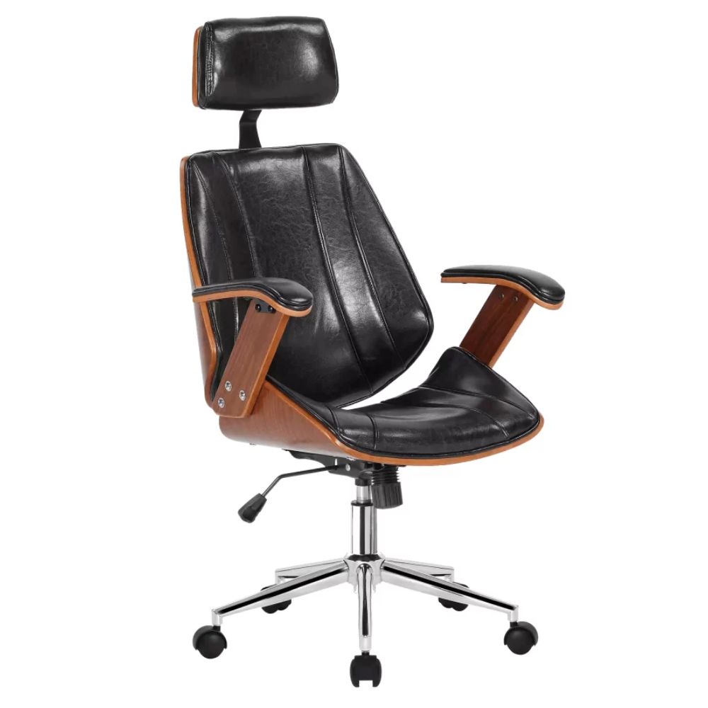 Material: Estrutura em madeira multilaminada com base cromada e assento e encosto revestido em couro ecológico (PU). Rodízio em PU (poliuretano).