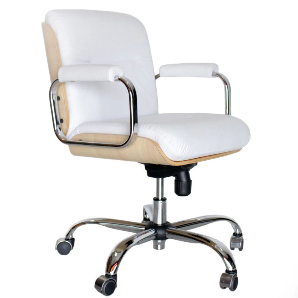 Base da cadeira em aço revestido em polipropileno, pistão a gás para ajuste de altura, capa de madeira multi-laminada, espuma de poliuretano e revestimento de couro ecológico.