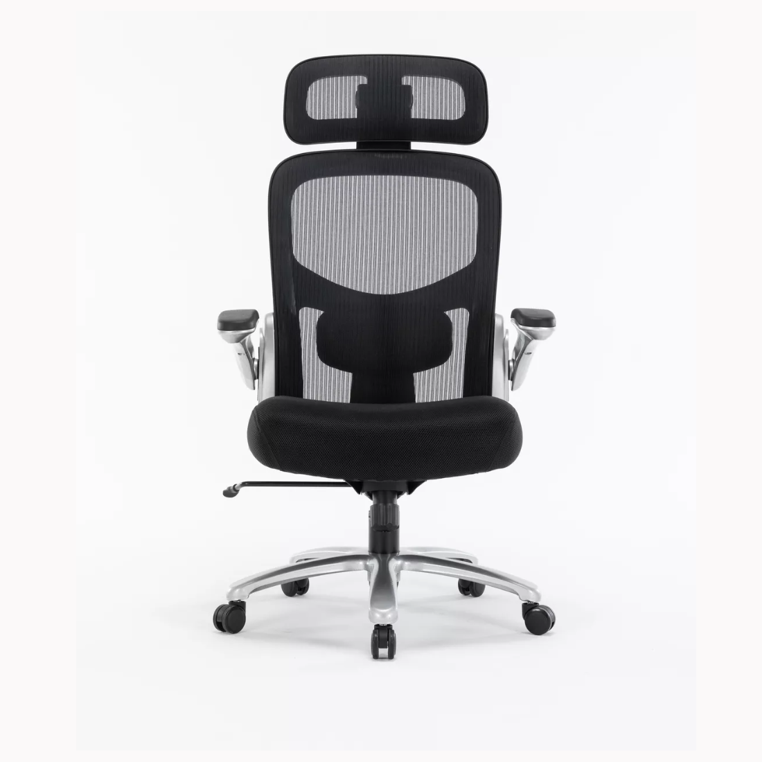 Encosto em tela de Poliéster com Nylon e apoio lombar. Com apoio de cabeça. Assento revestido em tecido spacer com espuma laminada de alta densidade e molas ensacadas. Braço retrátil com regulagem de altura e apoio em PU. Mecanismo reforçado relax com trava. Aranha reforçada em aço com pintura epóxi prata. Pistão preto classe 4. Rodízio de Nylon. Recomendada para até 180 Kg. 3 anos de garantia.