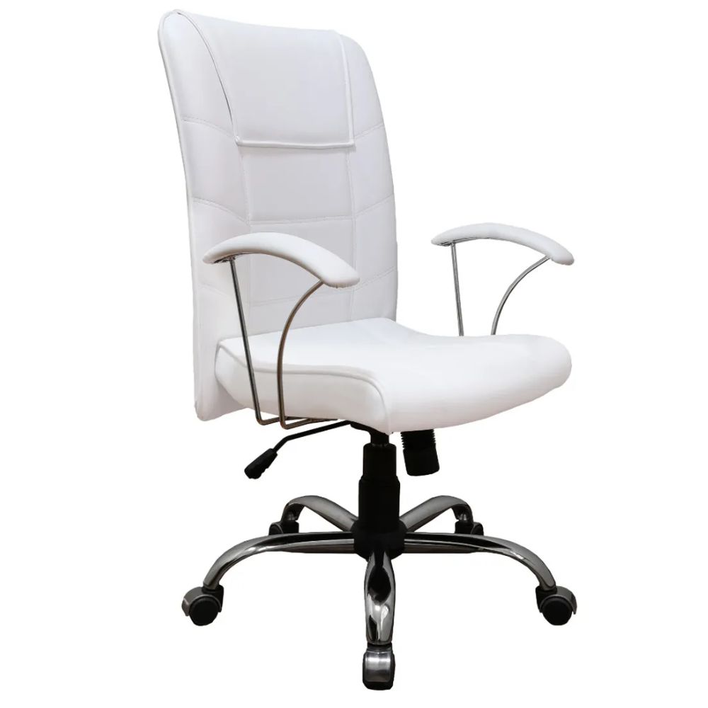 A cadeira possui base em aço com acabamento em polipropileno, pistão a gás para ajuste de altura, mecanismo relax para inclinação de assento e encosto, braços fixos em aço, espuma em poliuretano e revestimento em couro ecológico.