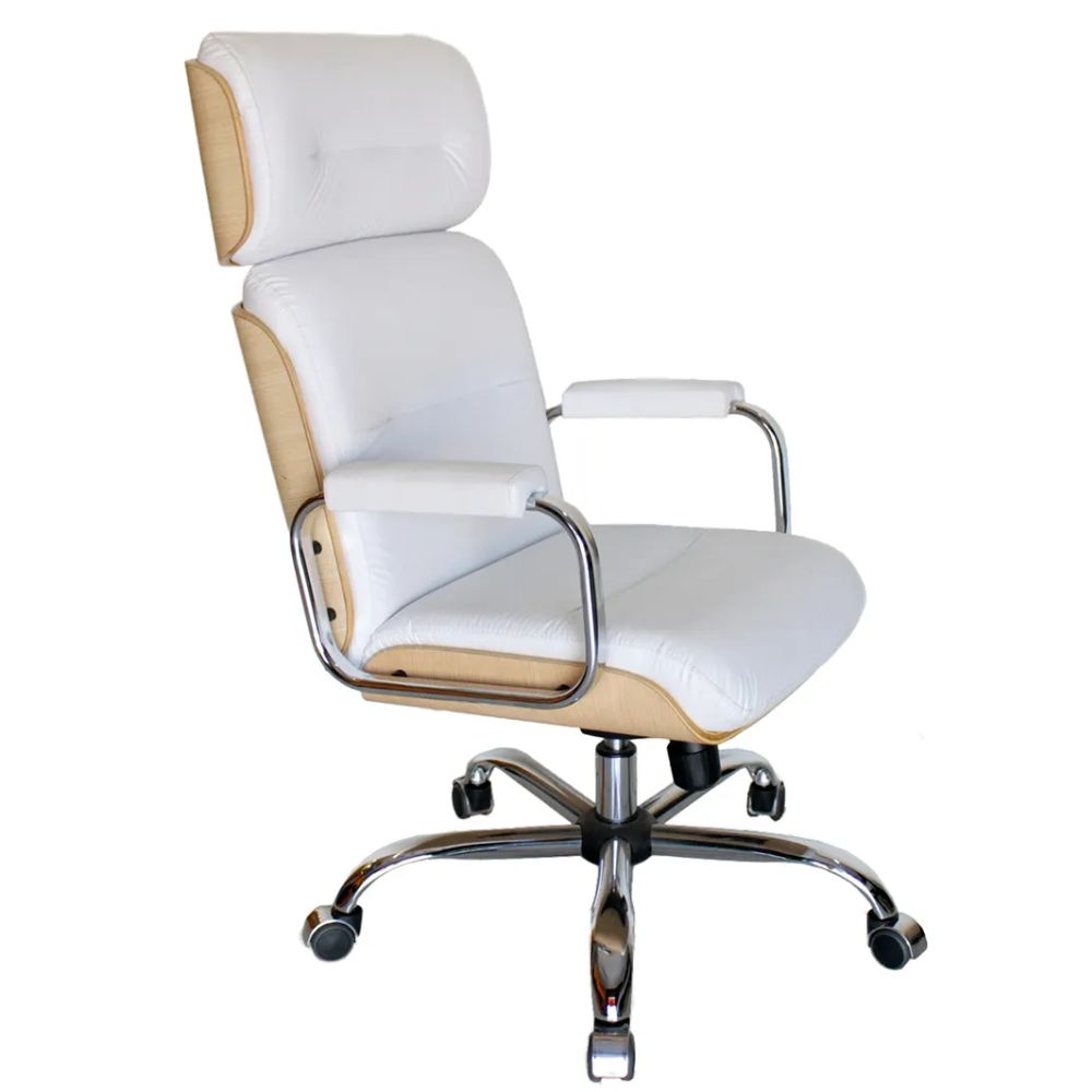 Base da cadeira em aço com acabamento em polipropileno, pistão a gás para ajuste de altura, capa de madeira multi-laminada, espuma de poliuretano e revestimento de couro ecológico.