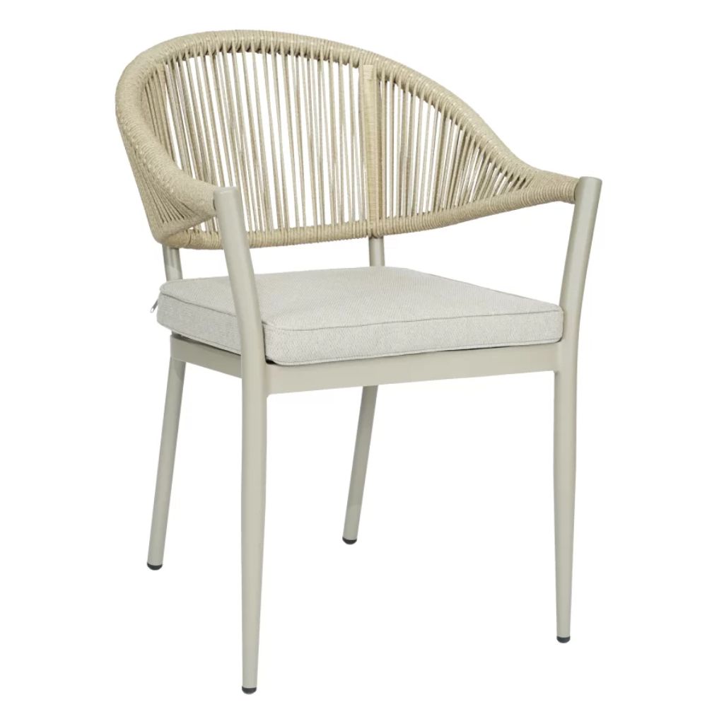 Descrição: A cadeira Amalfi é ideal para uso externo, unindo sofisticação e praticidade. Com estrutura resistente, encosto em corda náutica que adiciona leveza e um assento estofado em tecido claro, oferece conforto e estilo para compor ambientes elegantes e modernos.