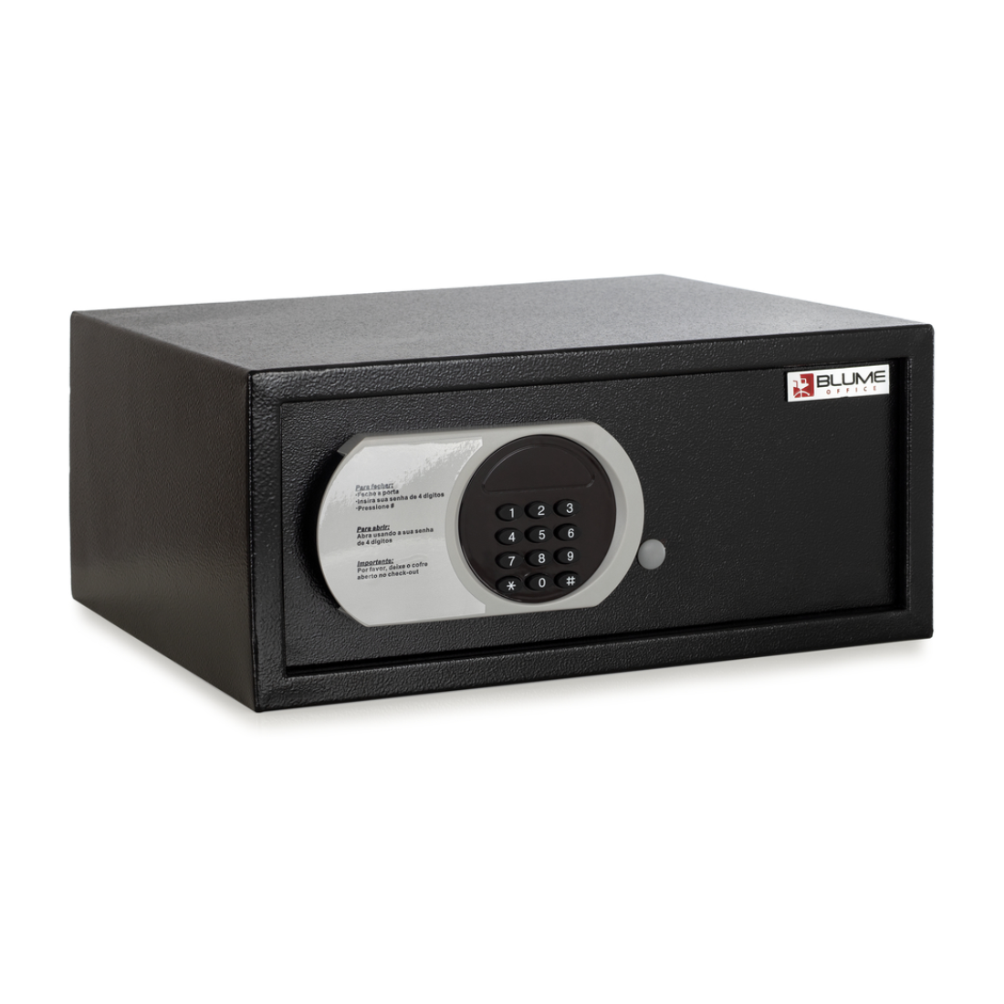 Cofre eletrônico em aço com senha programável e reprogramável de forma simples para uso em hotéis. Sistema de travamento de pinos duplos. Funcionamento a pilha. Furos de fixação préperfurados na parte de trás e no fundo. Acabamento de pintura a pó e piso acarpetado. Inclui: 4 parafusos para fixação e 2 chaves de emergência.Recomendada para até 350 Kg. 6 meses de garantia.