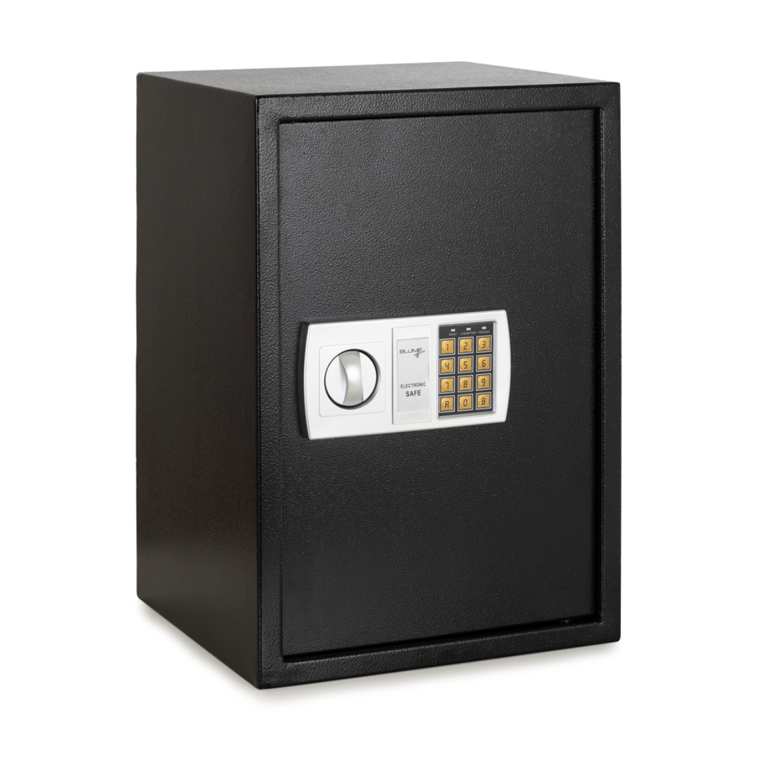 Cofre eletrônico em aço com senha programável. Sistema de travamento de pinos duplos. Funcionamento a pilha. Furos de fixação pré-perfurados na parte de trás e no fundo. Acabamento de pintura a pó e piso acarpetado. 1 Prateleira interna removível. Inclui: 4 parafusos para fixação e 2 chaves de emergência. 6 meses de garantia.