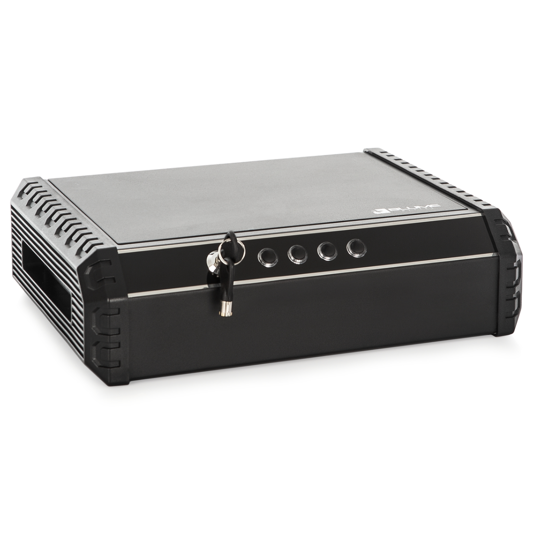 Cofre eletrônico para armas em aço com senha programável. Funcionamento a pilha. Furos de fixação pré-perfurados no fundo. Acabamento de pintura a pó e piso acarpetado: 4 parafusos para fixação e 2 chaves de emergência. 6 meses de garantia.