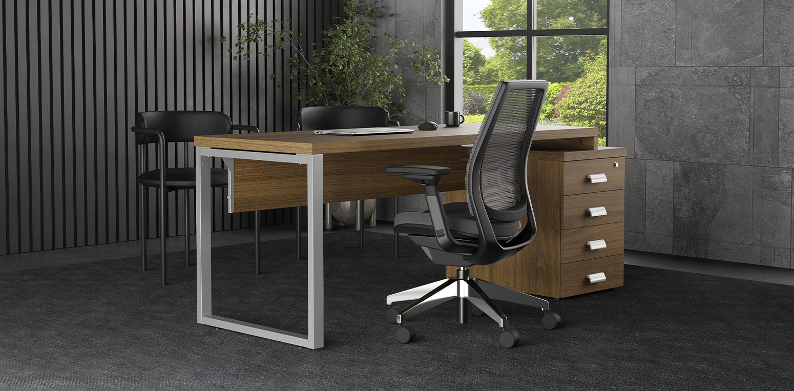 Cadeiras de visitante (ao fundo): Duas cadeiras fixas pretas, com estrutura metálica delgada e braços revestidos, Possuem assento e encosto estofados em couro sintético preto, transmitindo sofisticação e conforto, Estão posicionadas em frente à mesa, voltadas para o lado do usuário, indicando que esse ambiente é usado para reuniões curtas ou recepção de clientes.