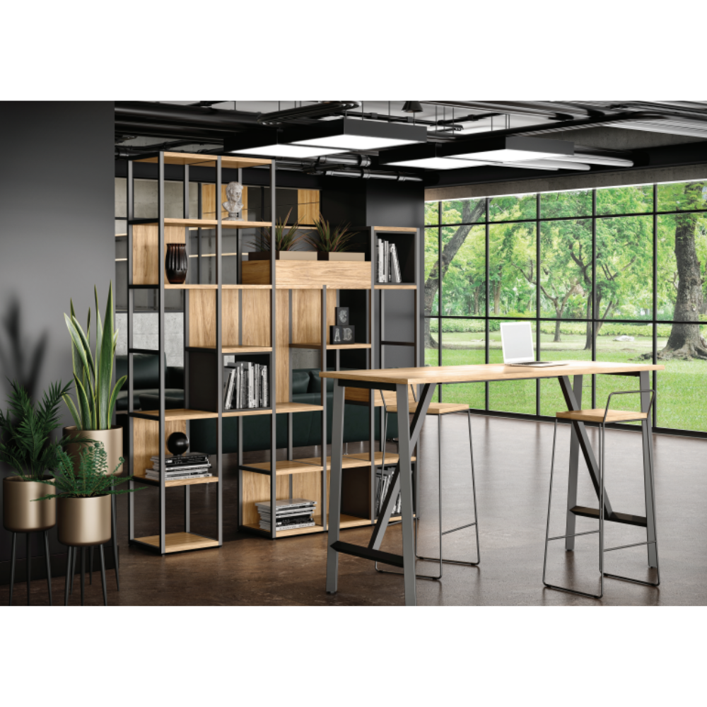 A mesa alta com estrutura metálica e tampo em madeira clara é a escolha ideal para ambientes que valorizam o dinamismo e a colaboração. Seu design limpo e contemporâneo combina robustez com leveza visual, adaptando-se perfeitamente a escritórios modernos, espaços de coworking, áreas de convivência ou cafés corporativos.