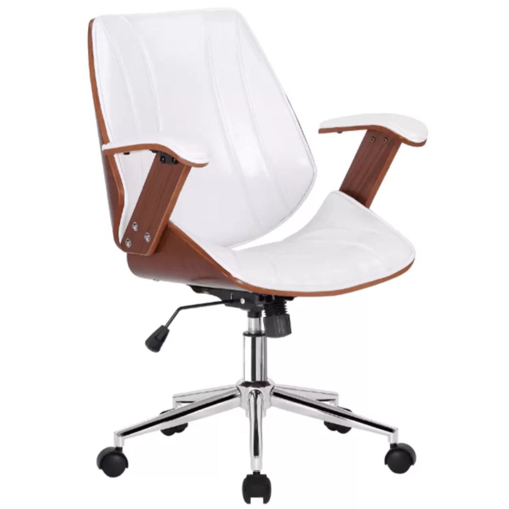 Material: Estrutura em madeira multilaminada com base cromada e assento e encosto revestido em couro ecológico (PU). Rodízio em PU (poliuretano).