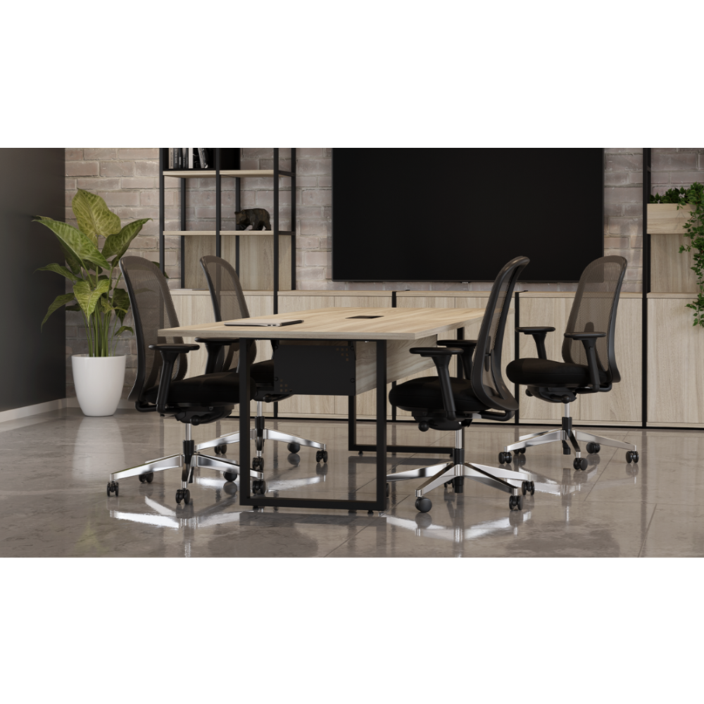 Ambiente corporativo elegante e funcional, projetado para reuniões e trabalhos em equipe. A mesa central em acabamento amadeirado com estrutura metálica robusta proporciona praticidade e estilo, enquanto as cadeiras ergonômicas com rodízios garantem conforto e mobilidade.